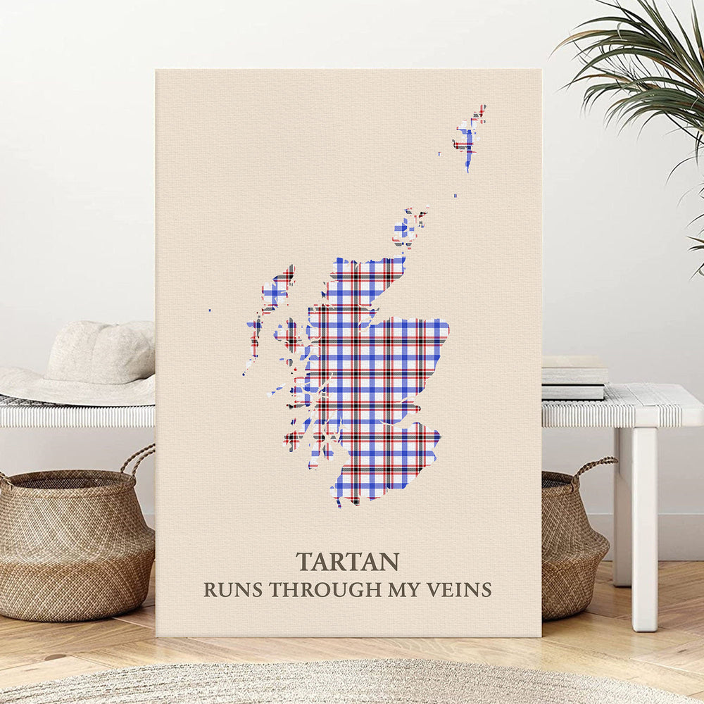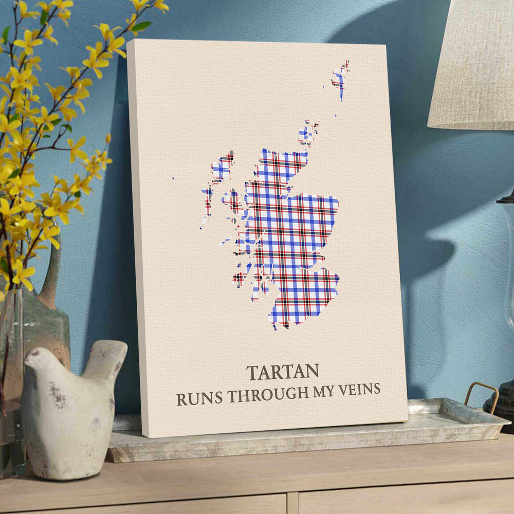 Celebrate your Scottish heritage with this striking canvas print featuring the map of Scotland filled with Boswell Modern tartan, paired with the bold phrase: “Tartan Runs Through My Veins.” Whether you're honoring your clan roots or gifting a loved one, this artwork brings deep cultural pride and Highland elegance to your space.