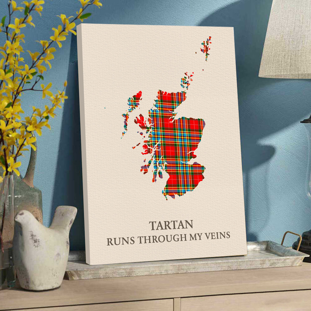 Celebrate your Scottish heritage with this striking canvas print featuring the map of Scotland filled with Chattan tartan, paired with the bold phrase: “Tartan Runs Through My Veins.” Whether you're honoring your clan roots or gifting a loved one, this artwork brings deep cultural pride and Highland elegance to your space.