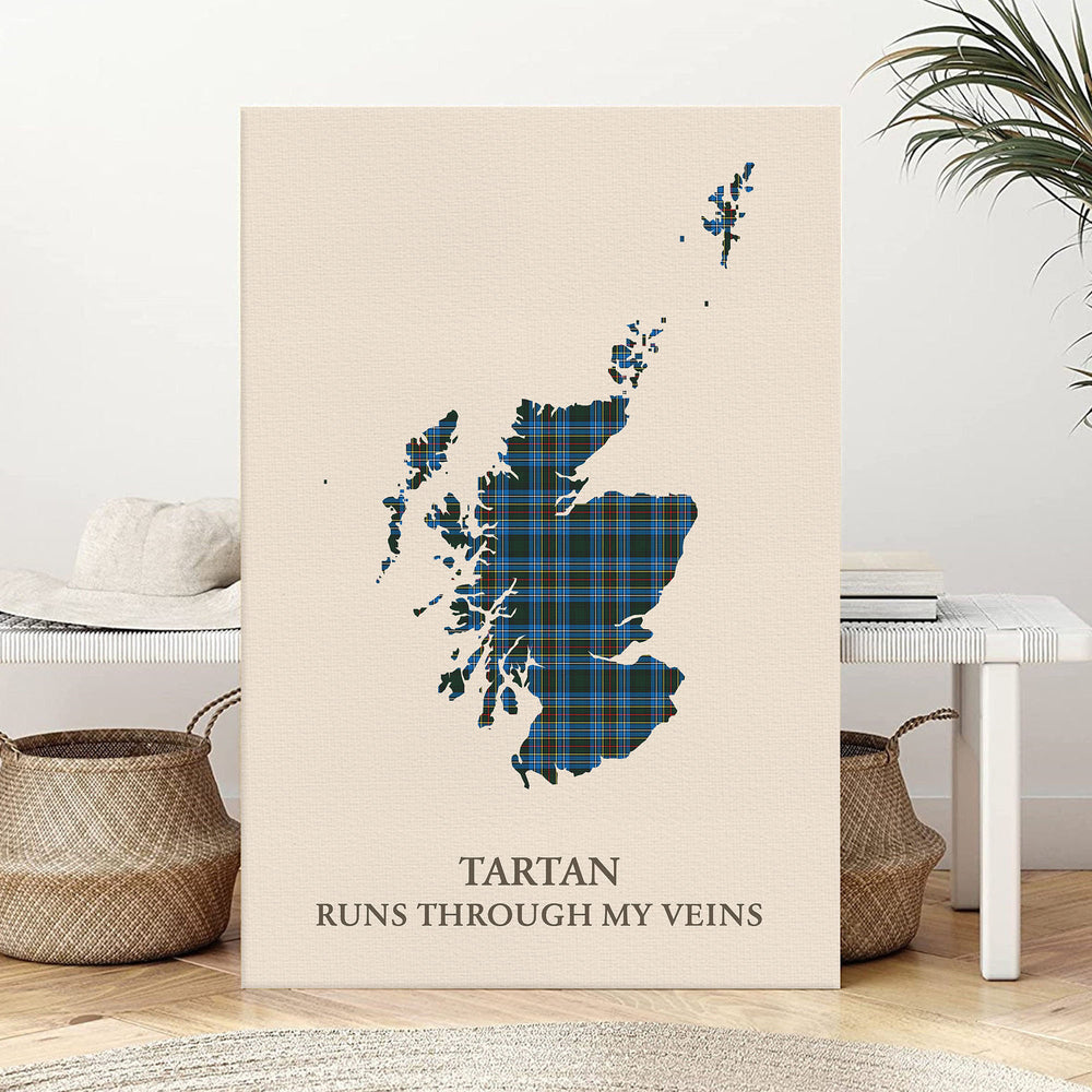 Celebrate your Scottish heritage with this striking canvas print featuring the map of Scotland filled with Cockburn Modern tartan, paired with the bold phrase: “Tartan Runs Through My Veins.” Whether you're honoring your clan roots or gifting a loved one, this artwork brings deep cultural pride and Highland elegance to your space.