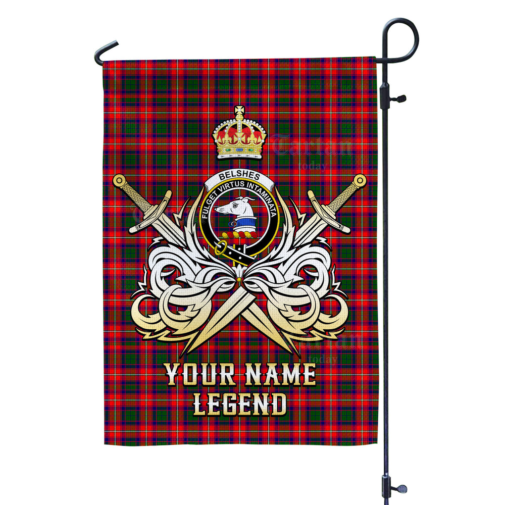 Custom Name Clan Belshe Tartan Garden Flag with Clan Crest and the Golden Sword of Courageous Legacy EC31