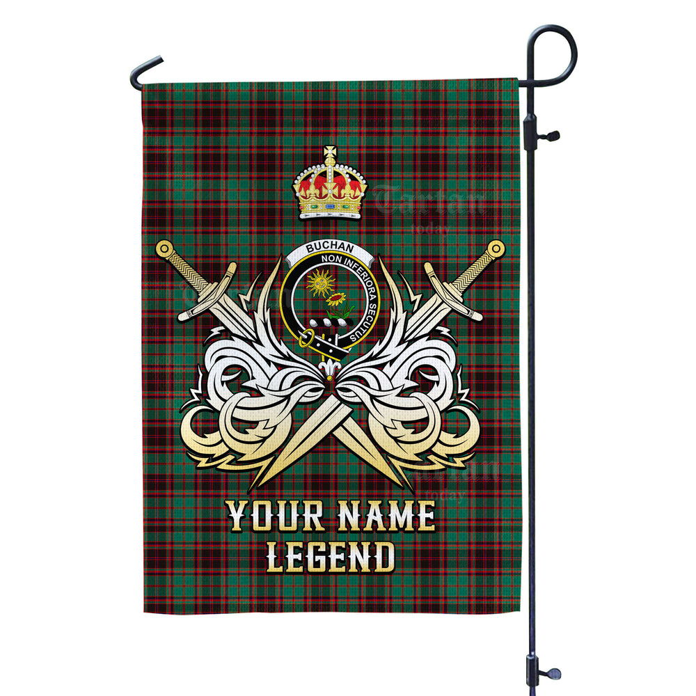 Custom Name Clan Buchan Ancient Tartan Garden Flag with Clan Crest and the Golden Sword of Courageous Legacy CR77