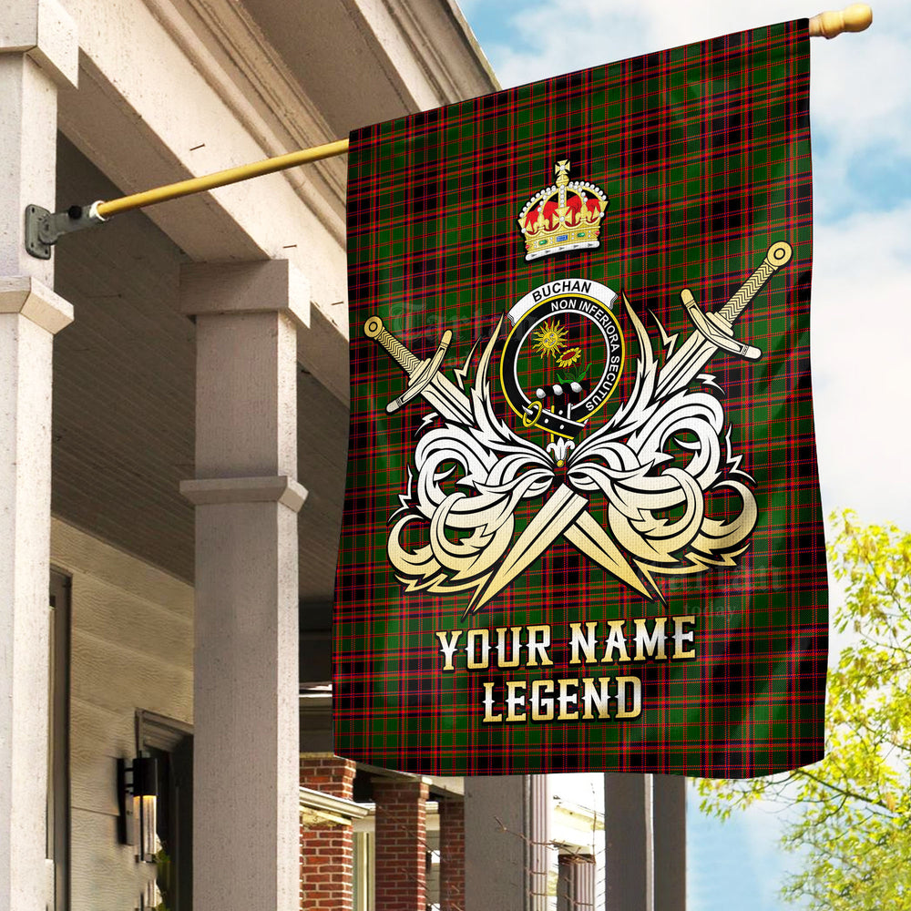 Custom Name Clan Buchan Modern Tartan Garden Flag with Clan Crest and the Golden Sword of Courageous Legacy RG69