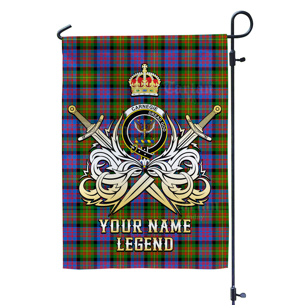 Custom Name Clan Carnegie Ancient Tartan Garden Flag with Clan Crest and the Golden Sword of Courageous Legacy UP38