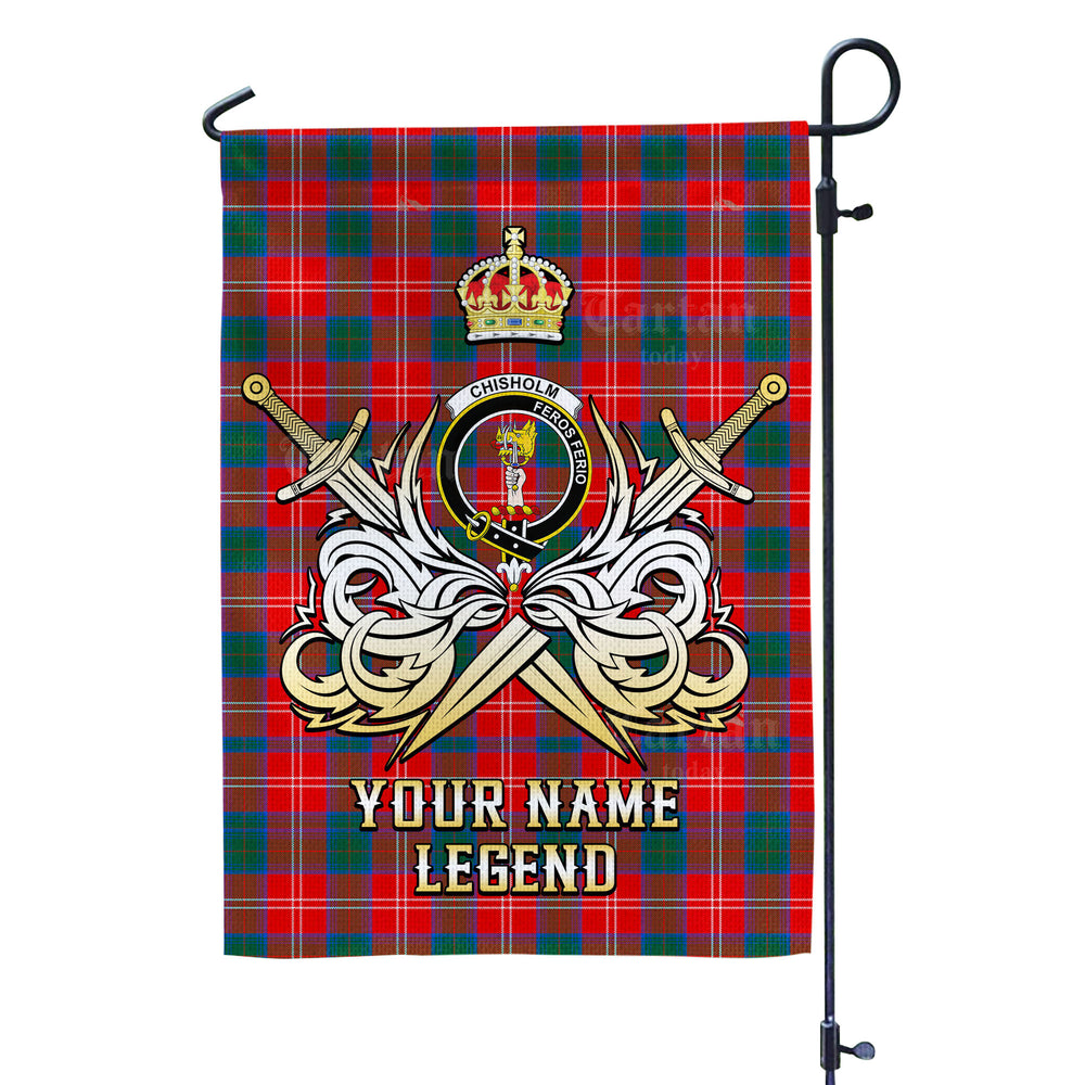 Custom Name Clan Chisholm Ancient Tartan Garden Flag with Clan Crest and the Golden Sword of Courageous Legacy UN52