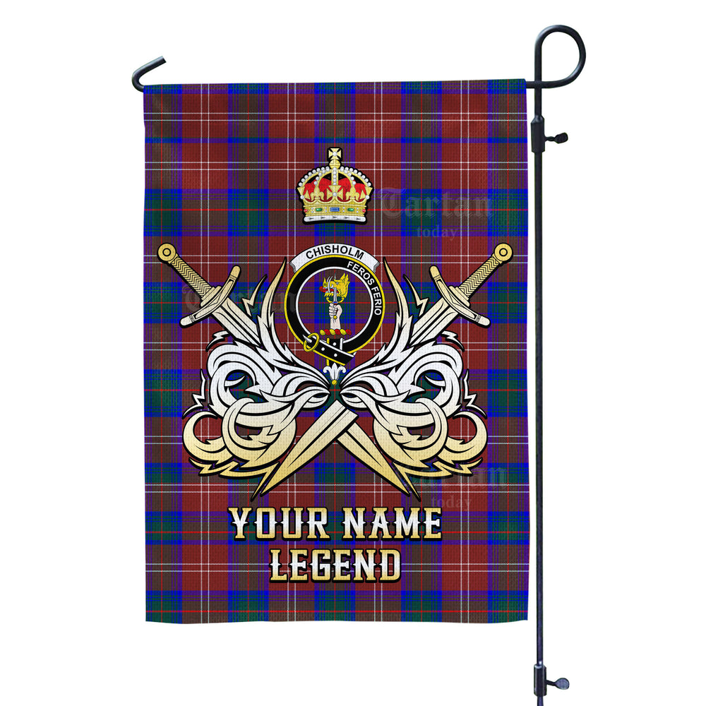 Custom Name Clan Chisholm Hunting Modern Tartan Garden Flag with Clan Crest and the Golden Sword of Courageous Legacy LB40