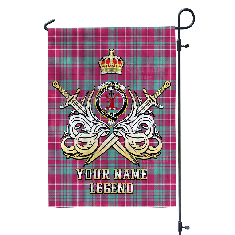 Custom Name Clan Crawford Ancient Tartan Garden Flag with Clan Crest and the Golden Sword of Courageous Legacy TK80