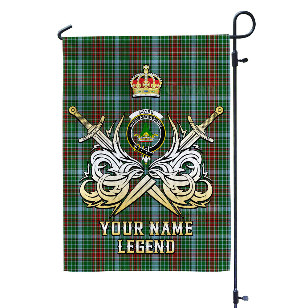 Custom Name Clan Gayre Tartan Garden Flag with Clan Crest and the Golden Sword of Courageous Legacy FK86