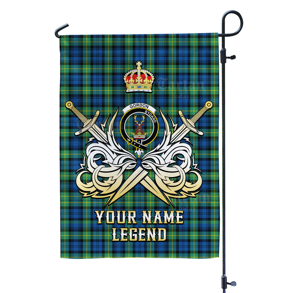 Custom Name Clan Gordon Ancient Tartan Garden Flag with Clan Crest and the Golden Sword of Courageous Legacy CF42