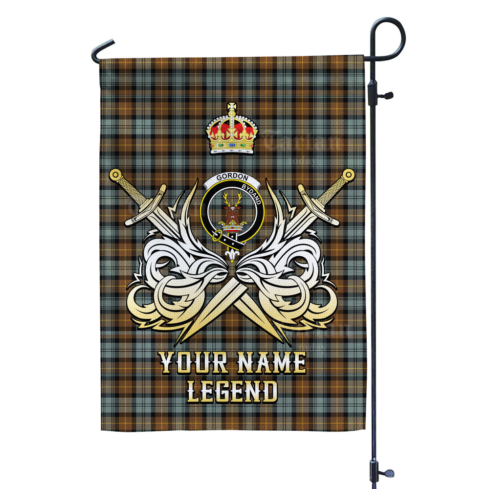 Custom Name Clan Gordon Weathered Tartan Garden Flag with Clan Crest and the Golden Sword of Courageous Legacy WB34
