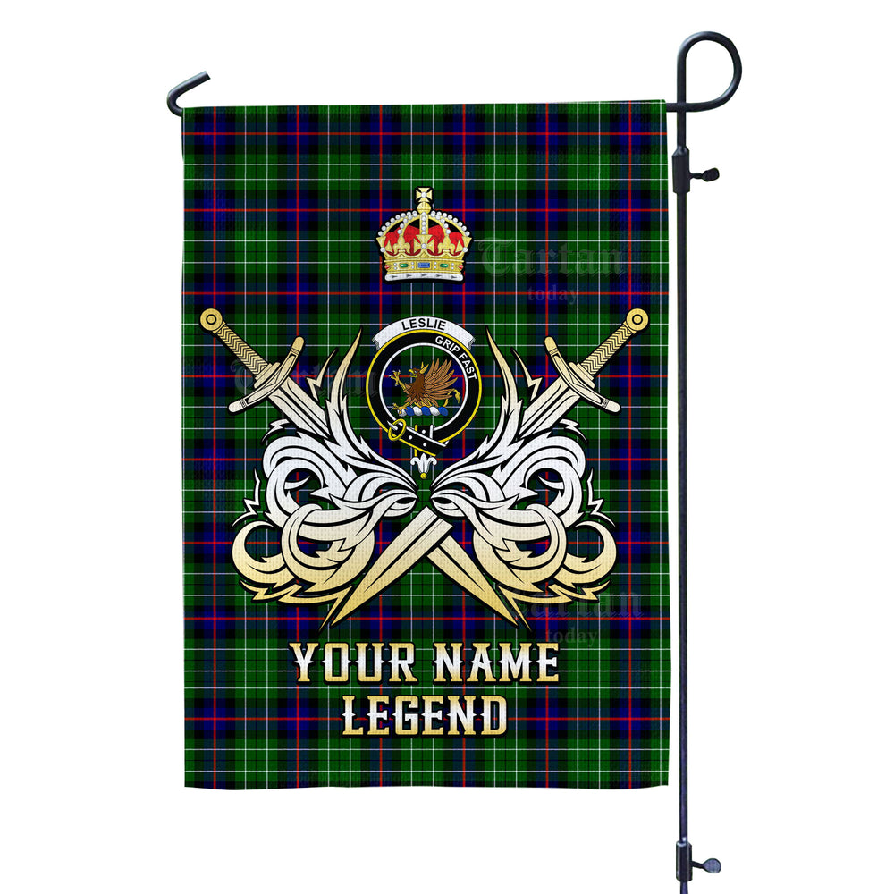 Custom Name Clan Leslie Hunting Tartan Garden Flag with Clan Crest and the Golden Sword of Courageous Legacy CM17