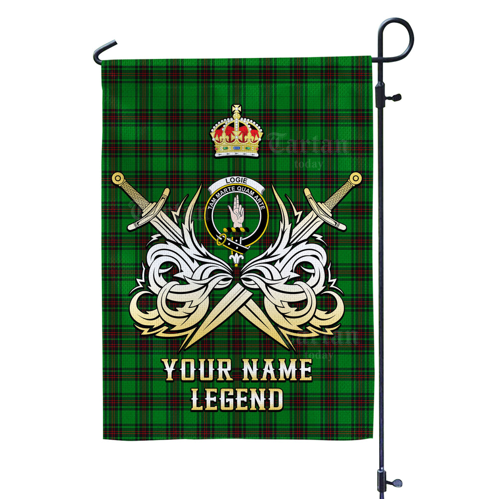 Custom Name Clan Logie Tartan Garden Flag with Clan Crest and the Golden Sword of Courageous Legacy RK97