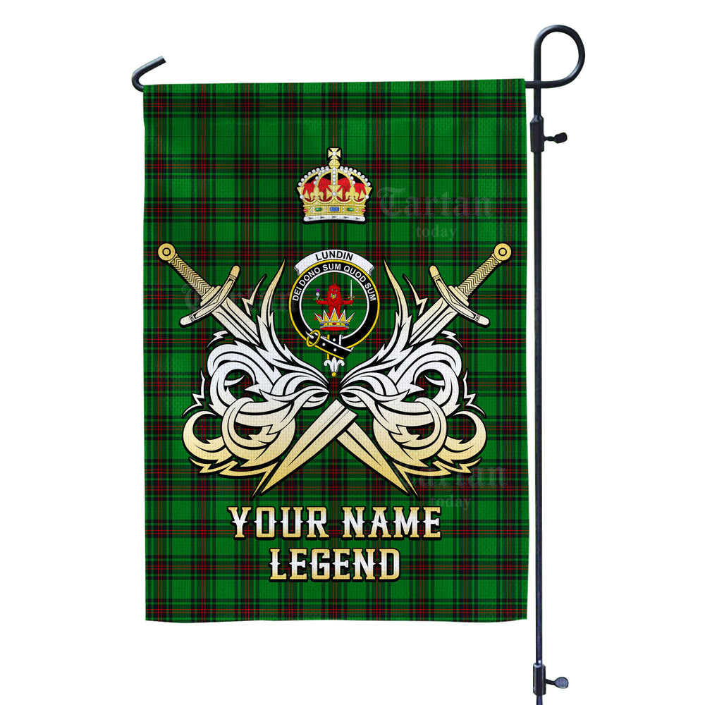 Custom Name Clan Lundin Tartan Garden Flag with Clan Crest and the Golden Sword of Courageous Legacy KB32