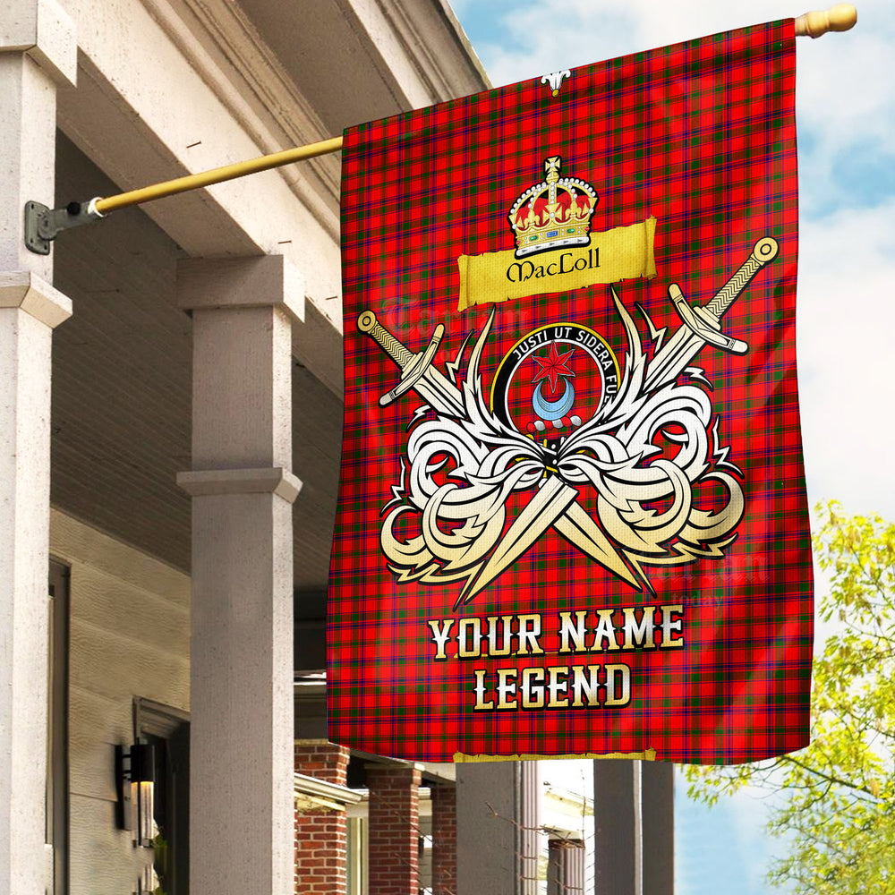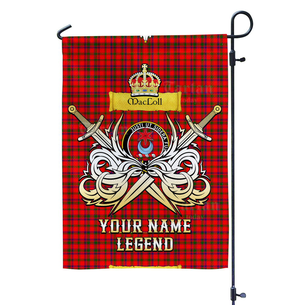 Custom Name Clan MacColl Modern Tartan Garden Flag with Clan Crest and the Golden Sword of Courageous Legacy DF31