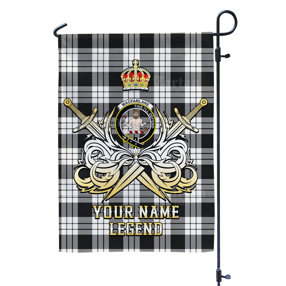 Custom Name Clan MacFarlane Black & White Ancient Tartan Garden Flag with Clan Crest and the Golden Sword of Courageous Legacy WV53