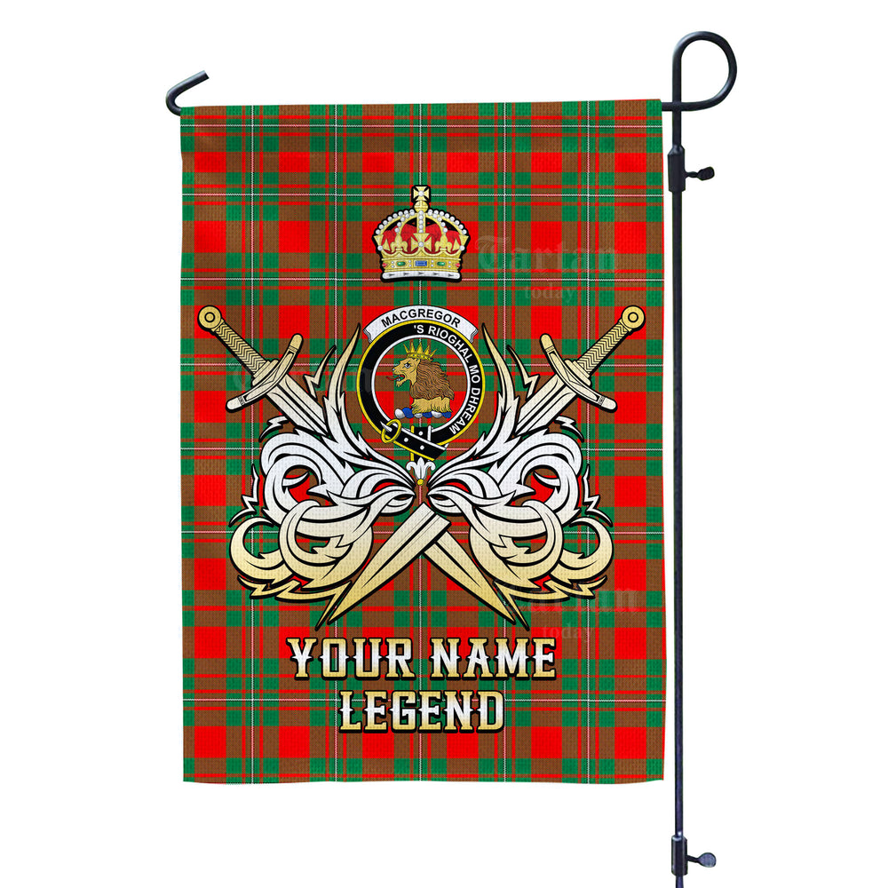 Custom Name Clan MacGregor Ancient Tartan Garden Flag with Clan Crest and the Golden Sword of Courageous Legacy WA85