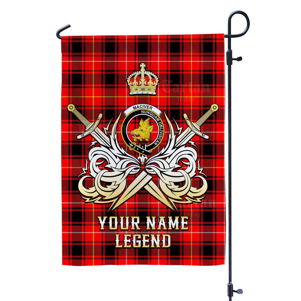 Custom Name Clan MacIver Modern Tartan Garden Flag with Clan Crest and the Golden Sword of Courageous Legacy CI74