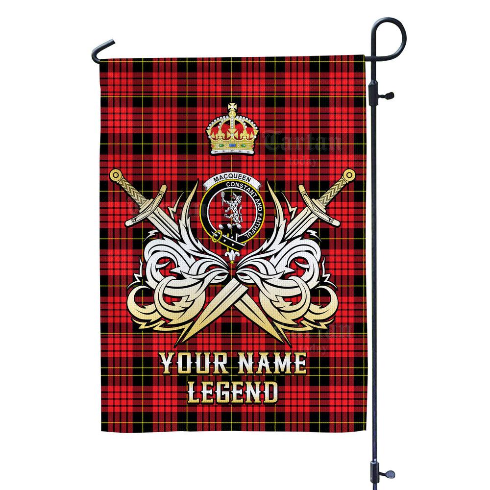 Custom Name Clan MacQueen Modern Tartan Garden Flag with Clan Crest and the Golden Sword of Courageous Legacy OV62
