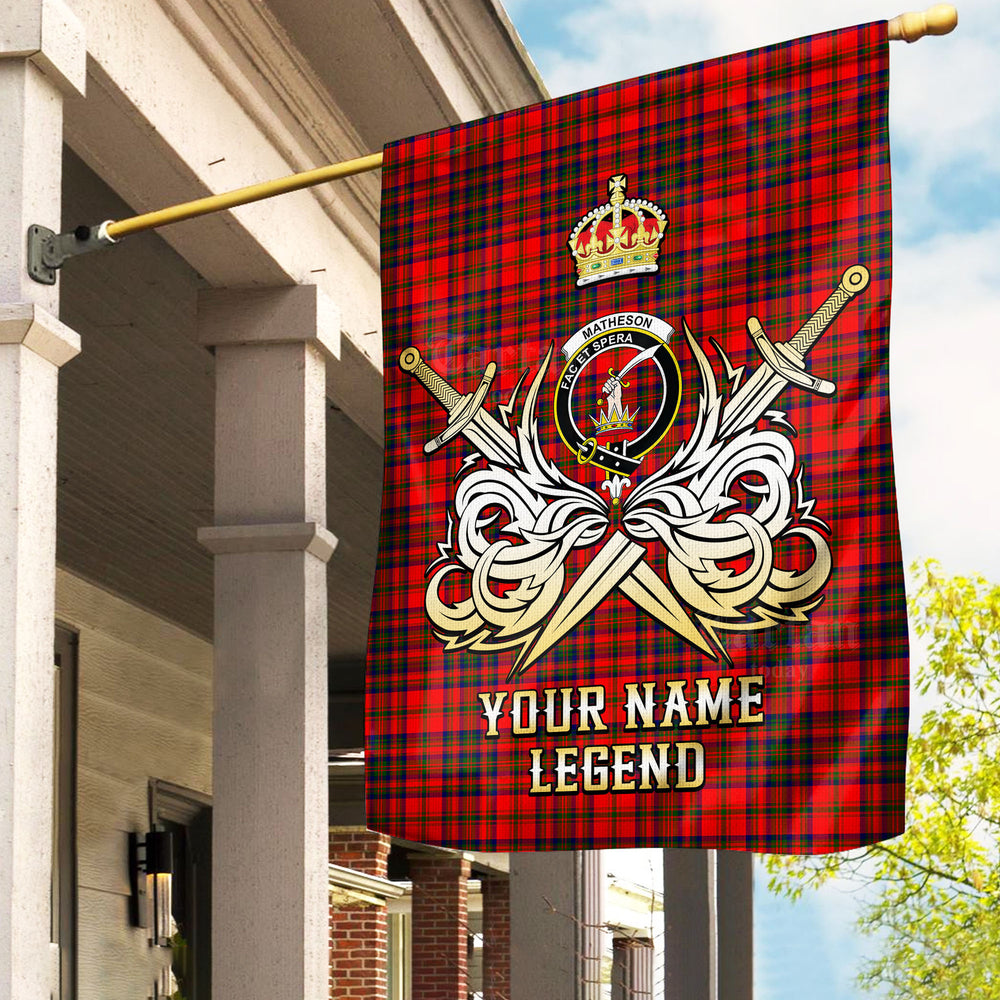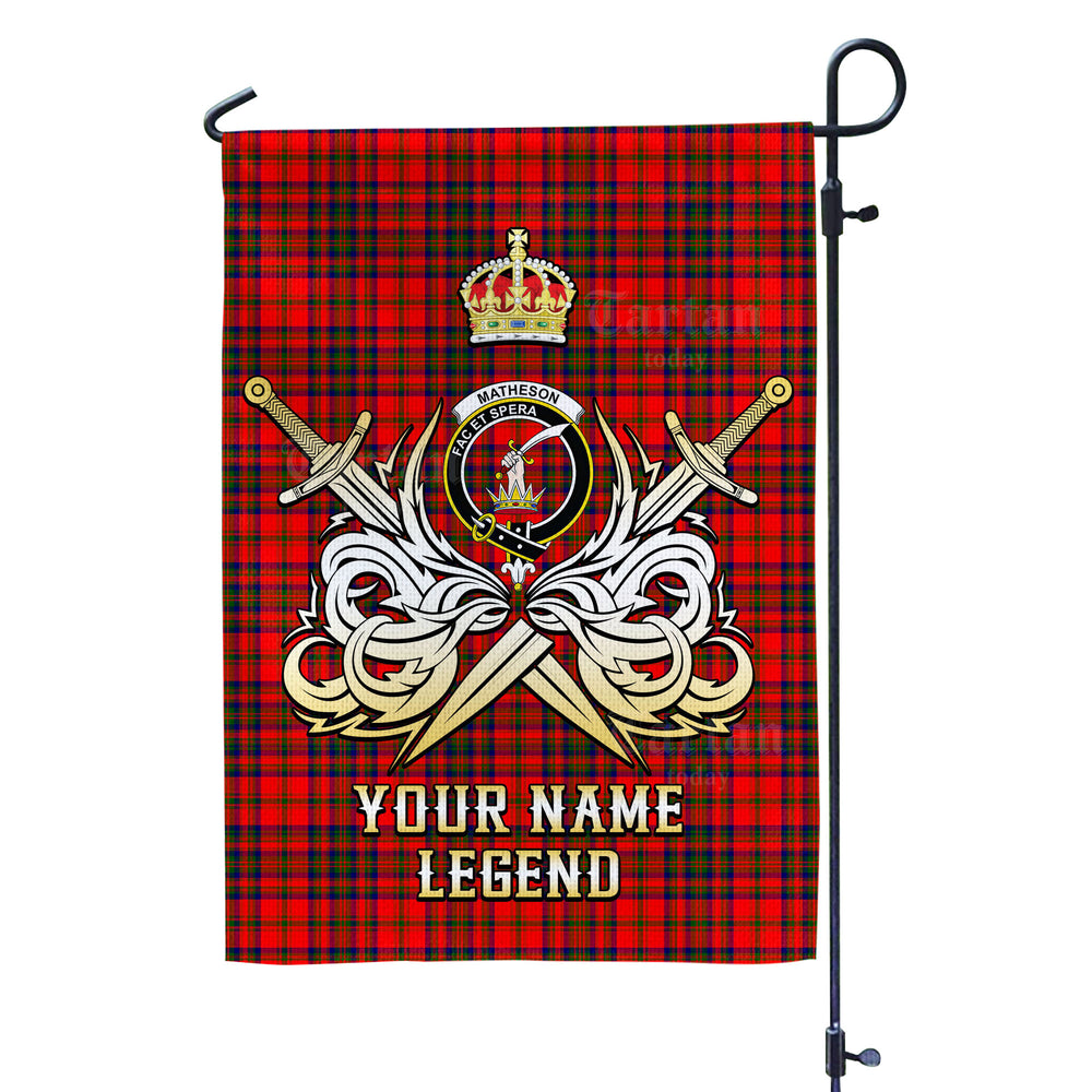 Custom Name Clan Matheson Modern Tartan Garden Flag with Clan Crest and the Golden Sword of Courageous Legacy WE73