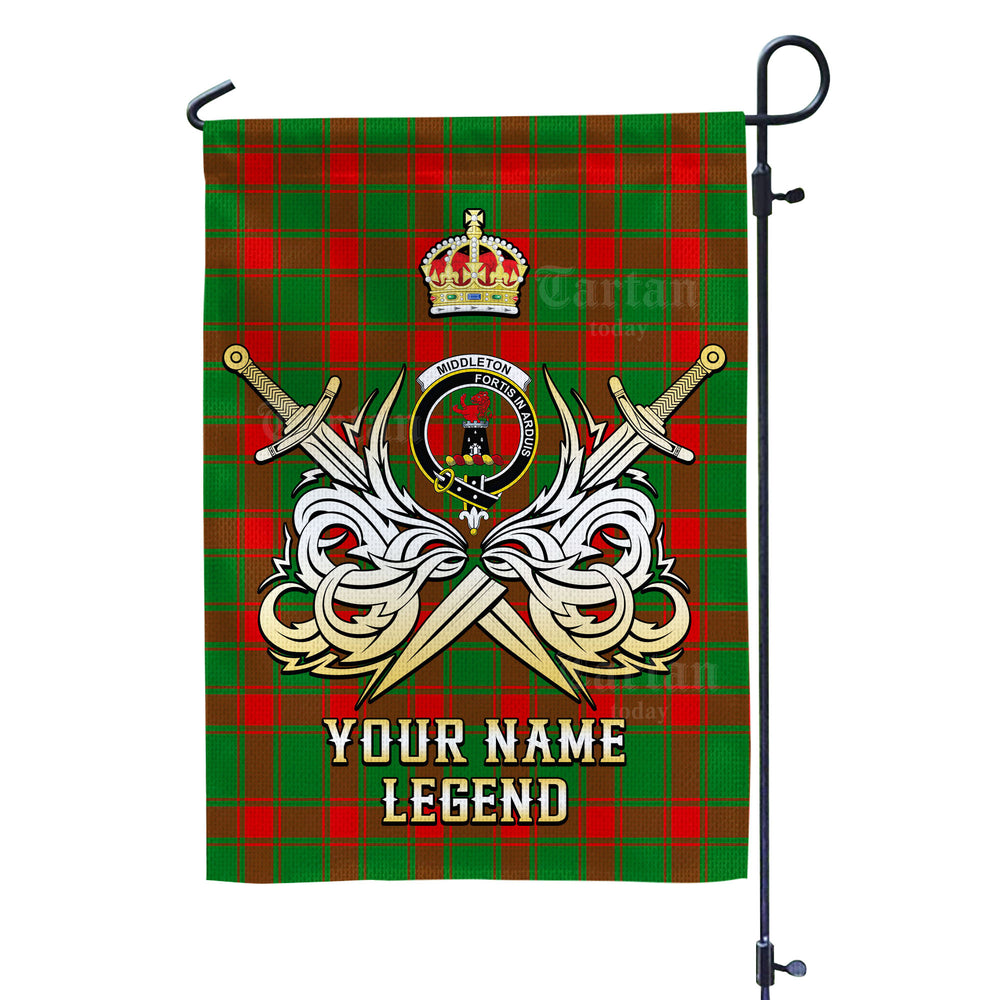 Custom Name Clan Middleton Modern Tartan Garden Flag with Clan Crest and the Golden Sword of Courageous Legacy DI56