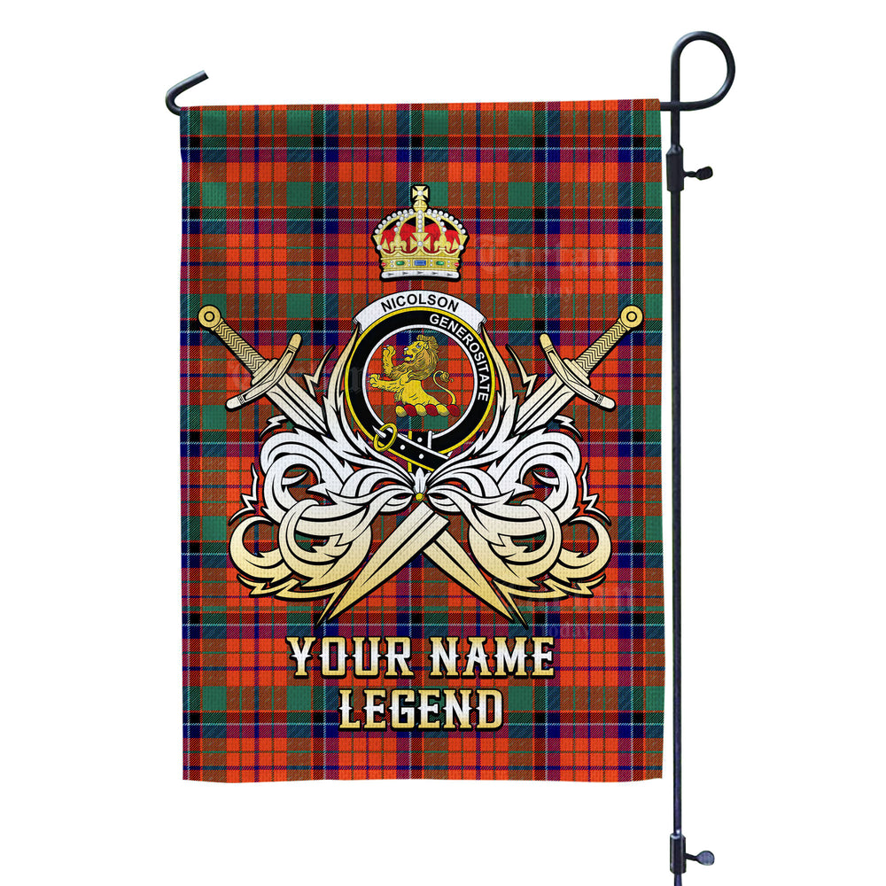 Custom Name Clan Nicolson Ancient Tartan Garden Flag with Clan Crest and the Golden Sword of Courageous Legacy CN21