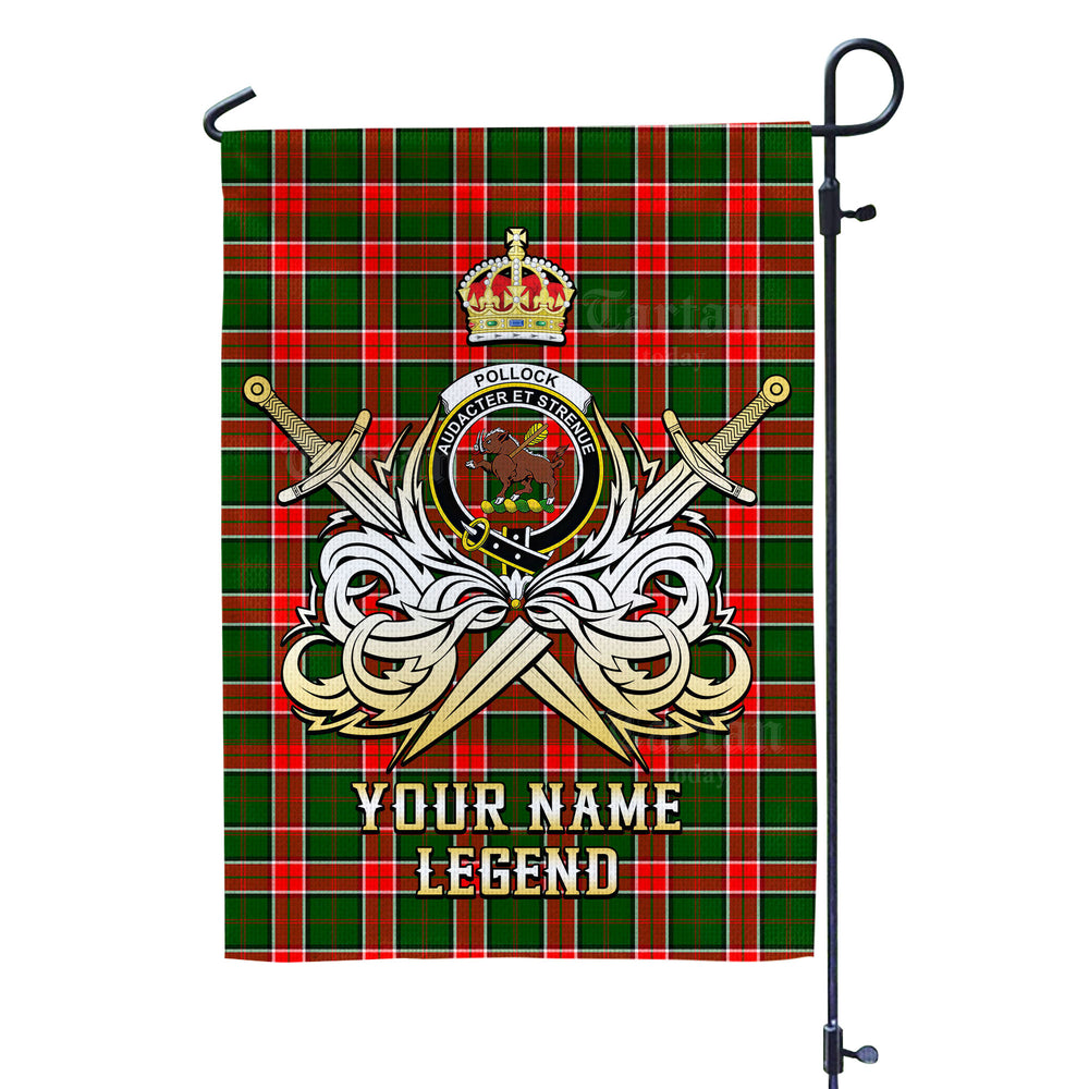 Custom Name Clan Pollock Modern Tartan Garden Flag with Clan Crest and the Golden Sword of Courageous Legacy VX62