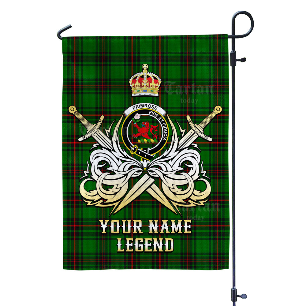 Custom Name Clan Primrose (Fife) Tartan Garden Flag with Clan Crest and the Golden Sword of Courageous Legacy PQ36