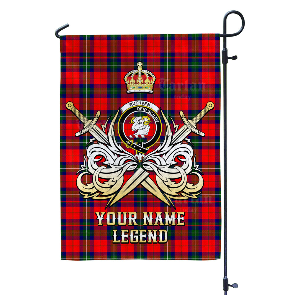 Custom Name Clan Ruthven Modern Tartan Garden Flag with Clan Crest and the Golden Sword of Courageous Legacy LV22