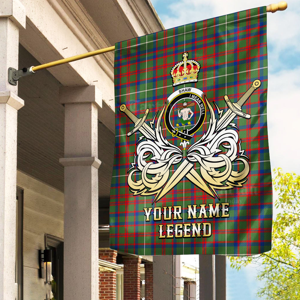 Custom Name Clan Shaw Green Modern Tartan Garden Flag with Clan Crest and the Golden Sword of Courageous Legacy XS77