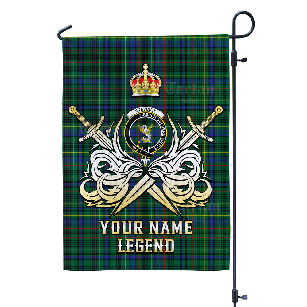 Custom Name Clan Stewart Hunting Modern Tartan Garden Flag with Clan Crest and the Golden Sword of Courageous Legacy RT38