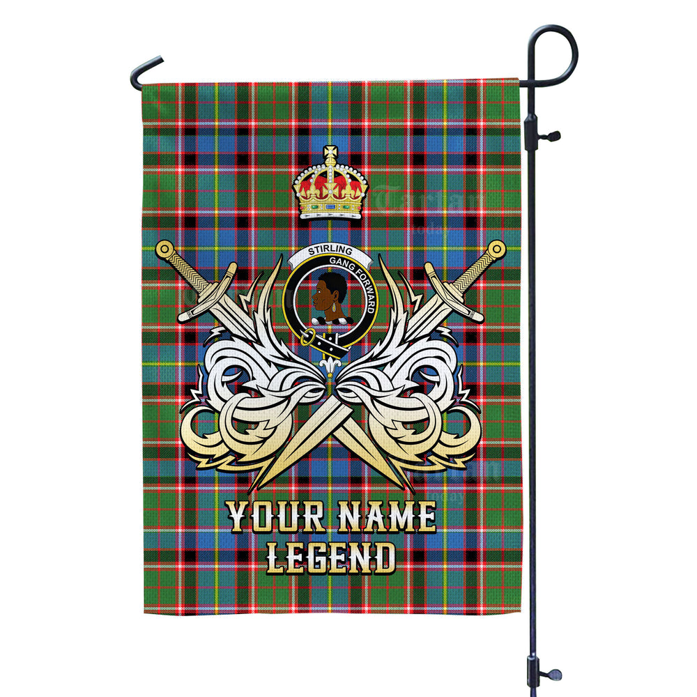Custom Name Clan Stirling (of Keir) Tartan Garden Flag with Clan Crest and the Golden Sword of Courageous Legacy QM65