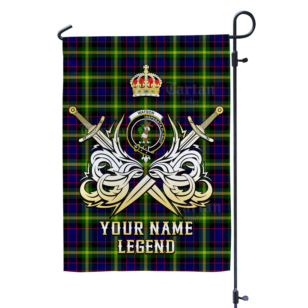 Custom Name Clan Watson Modern Tartan Garden Flag with Clan Crest and the Golden Sword of Courageous Legacy JN85