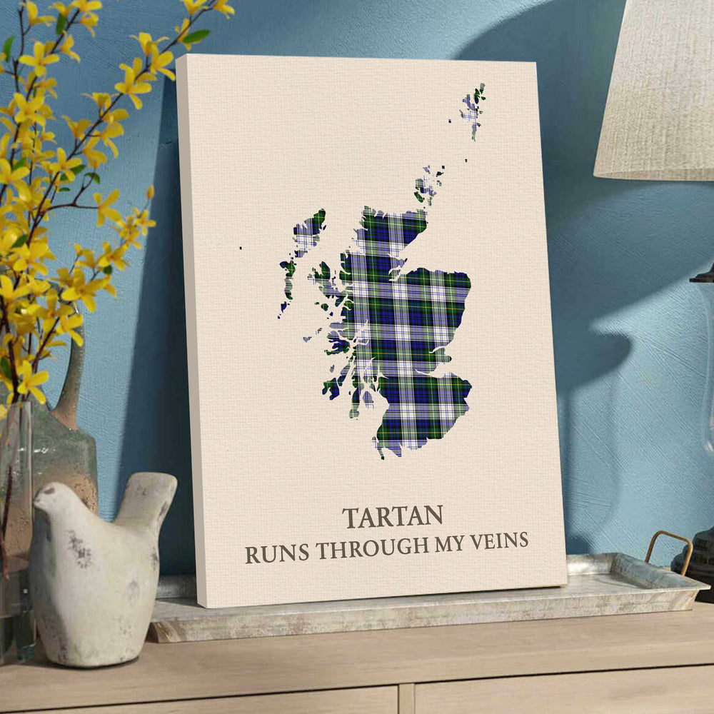 Celebrate your Scottish heritage with this striking canvas print featuring the map of Scotland filled with Gordon Dress Modern tartan, paired with the bold phrase: “Tartan Runs Through My Veins.” Whether you're honoring your clan roots or gifting a loved one, this artwork brings deep cultural pride and Highland elegance to your space.
