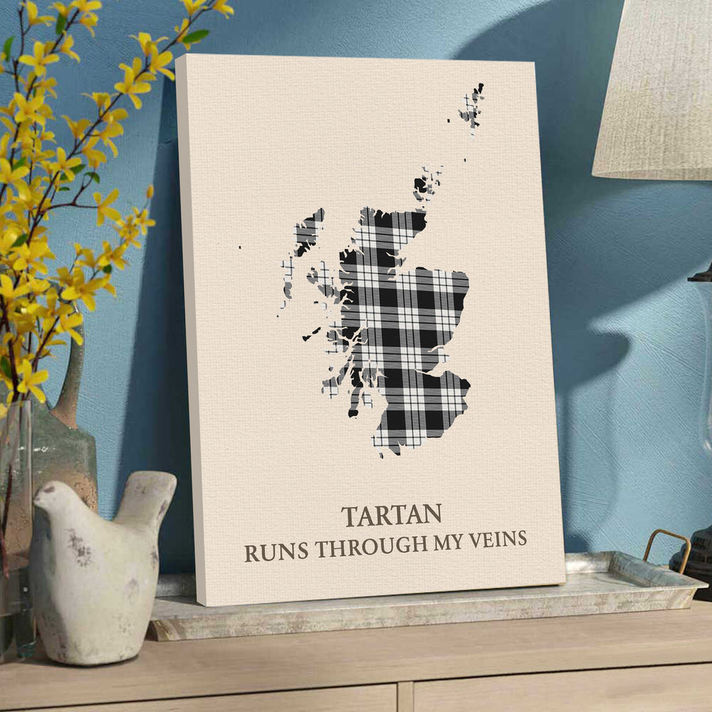 Celebrate your Scottish heritage with this striking canvas print featuring the map of Scotland filled with MacFarlane Black & White Ancient tartan, paired with the bold phrase: “Tartan Runs Through My Veins.” Whether you're honoring your clan roots or gifting a loved one, this artwork brings deep cultural pride and Highland elegance to your space.