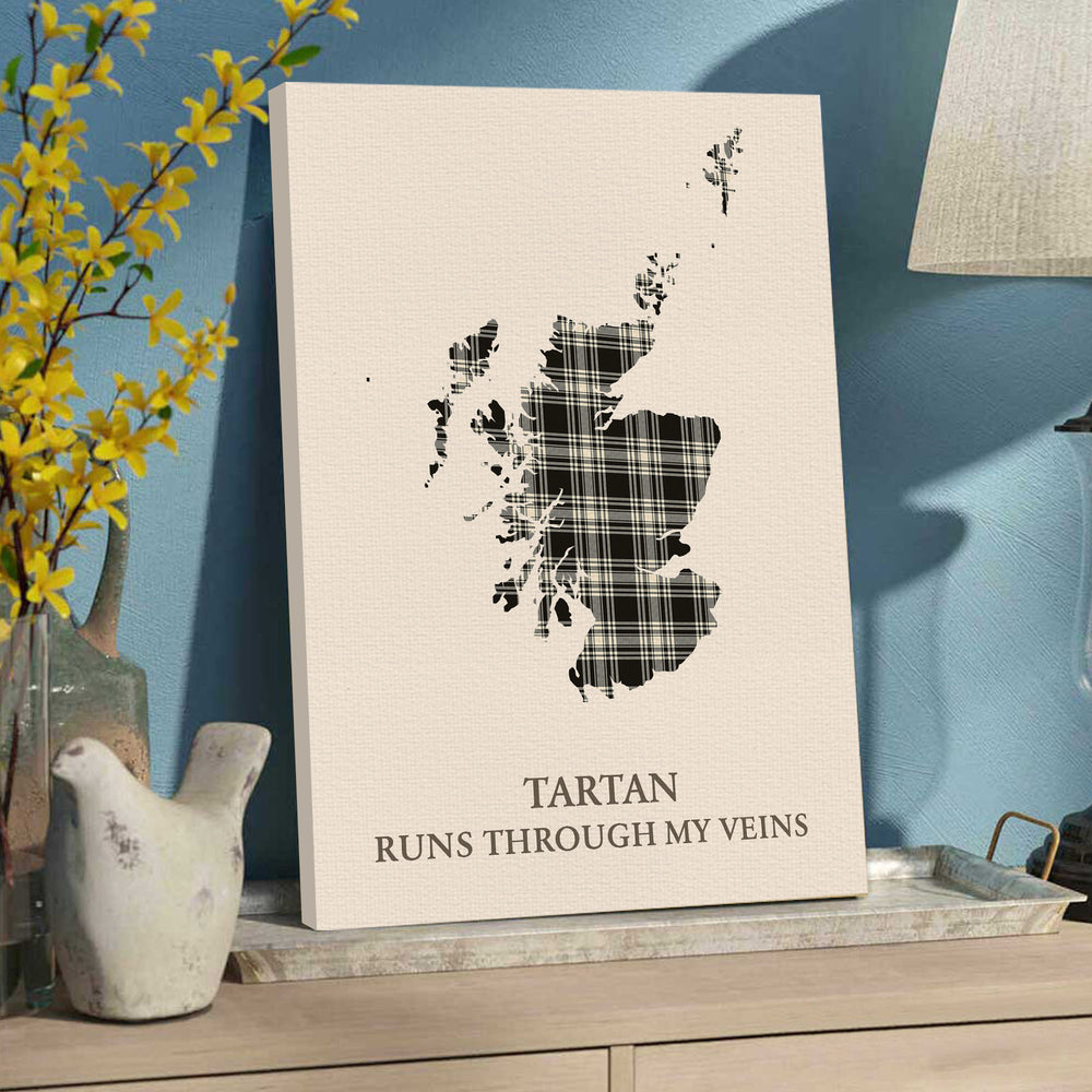 Celebrate your Scottish heritage with this striking canvas print featuring the map of Scotland filled with Menzies Black & White Ancient tartan, paired with the bold phrase: “Tartan Runs Through My Veins.” Whether you're honoring your clan roots or gifting a loved one, this artwork brings deep cultural pride and Highland elegance to your space.