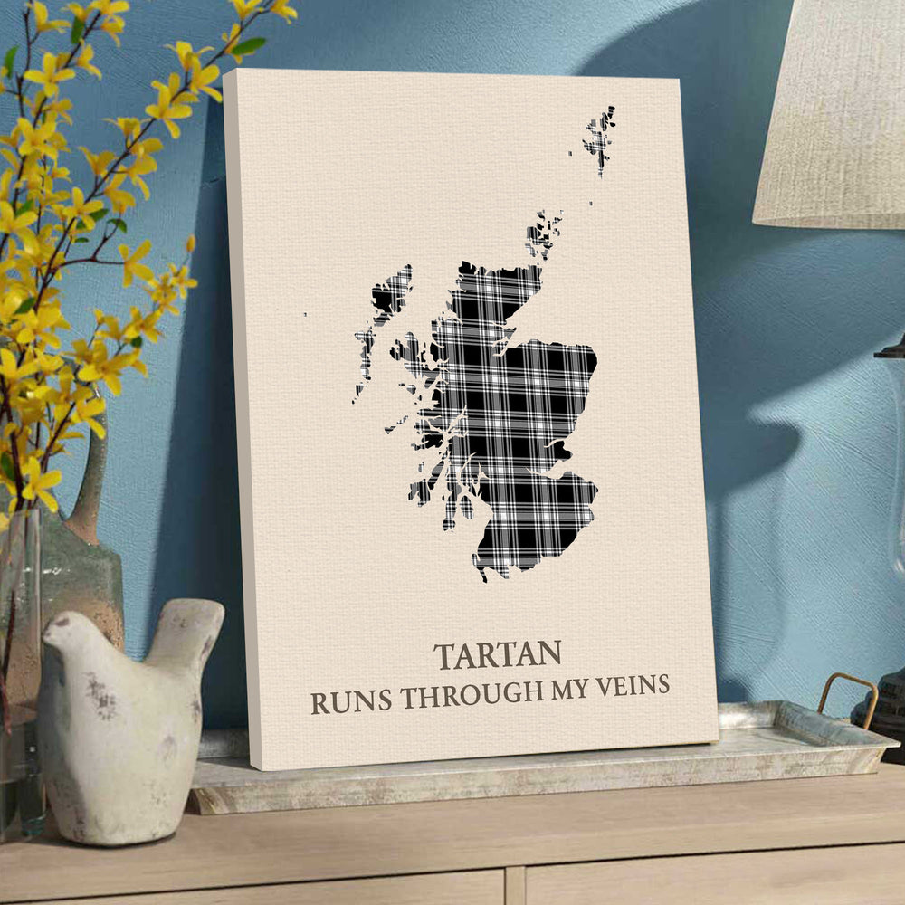 Celebrate your Scottish heritage with this striking canvas print featuring the map of Scotland filled with Menzies Black & White Modern tartan, paired with the bold phrase: “Tartan Runs Through My Veins.” Whether you're honoring your clan roots or gifting a loved one, this artwork brings deep cultural pride and Highland elegance to your space.