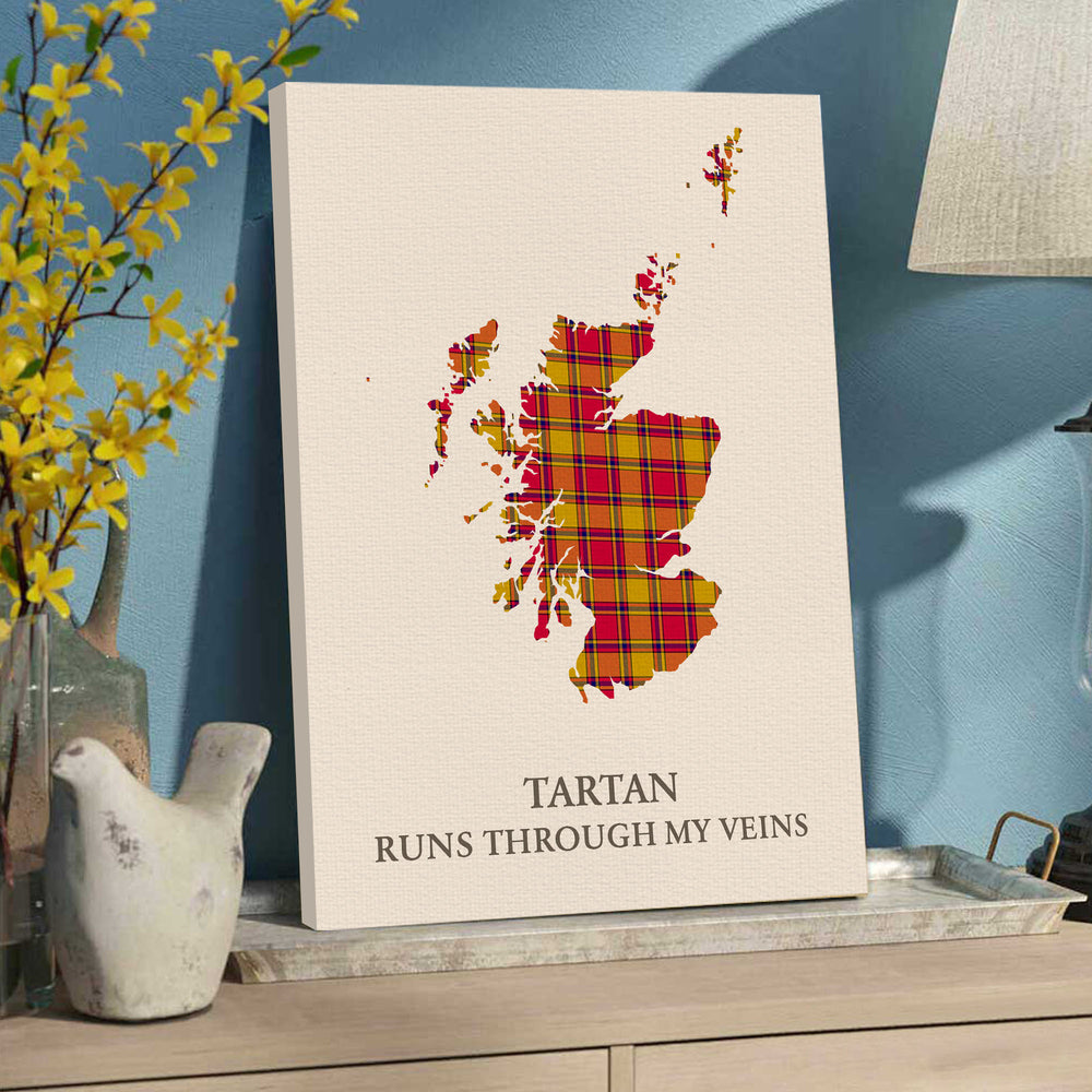 Celebrate your Scottish heritage with this striking canvas print featuring the map of Scotland filled with Scrymgeour tartan, paired with the bold phrase: “Tartan Runs Through My Veins.” Whether you're honoring your clan roots or gifting a loved one, this artwork brings deep cultural pride and Highland elegance to your space.