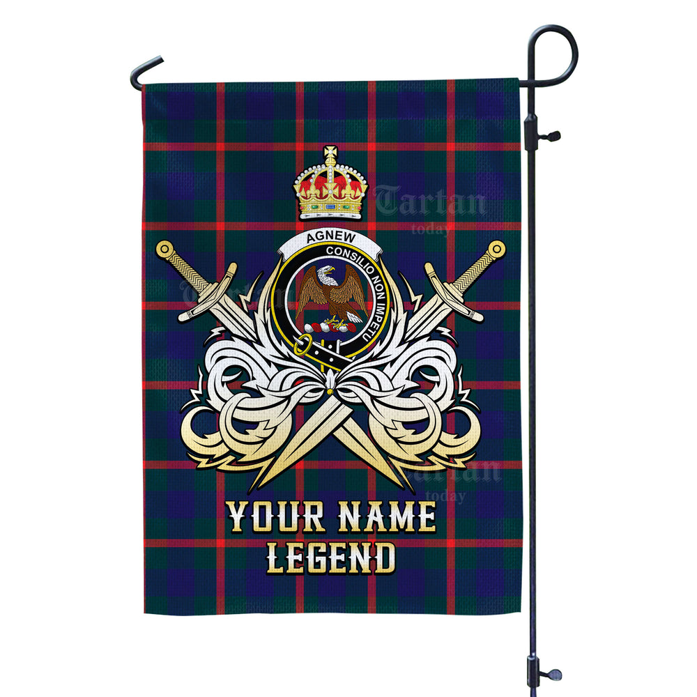Custom Name Clan Agnew Modern Tartan Garden Flag with Clan Crest and the Golden Sword of Courageous Legacy PR60