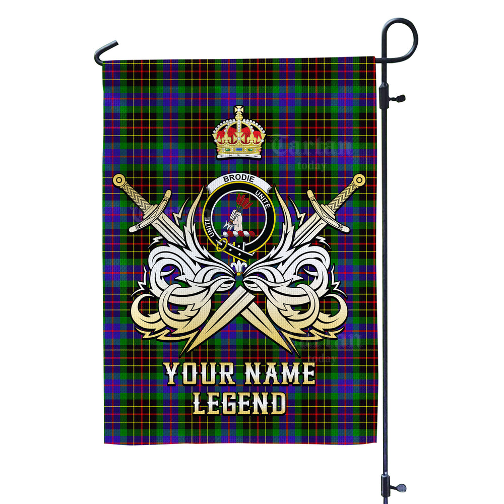 Custom Name Clan Brodie Hunting Modern Tartan Garden Flag with Clan Crest and the Golden Sword of Courageous Legacy XY26
