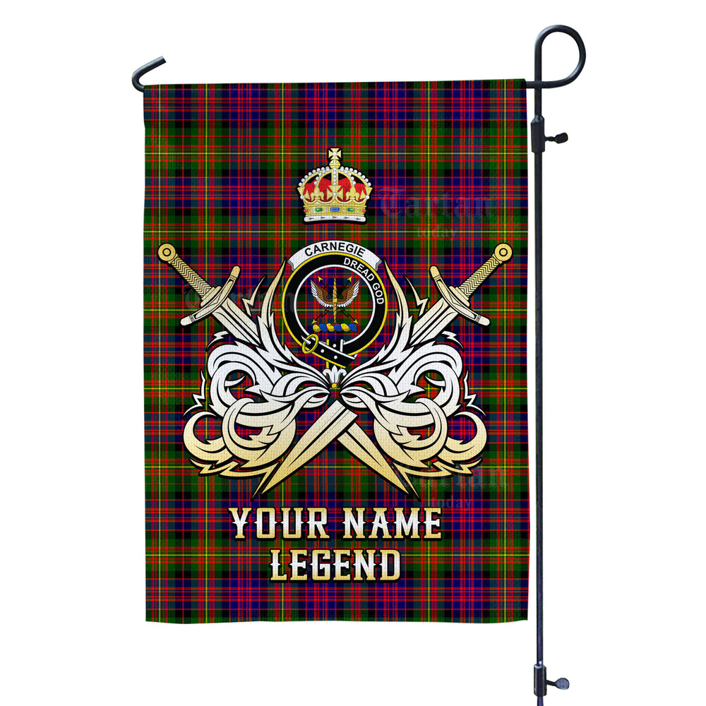 Custom Name Clan Carnegie Modern Tartan Garden Flag with Clan Crest and the Golden Sword of Courageous Legacy CK59