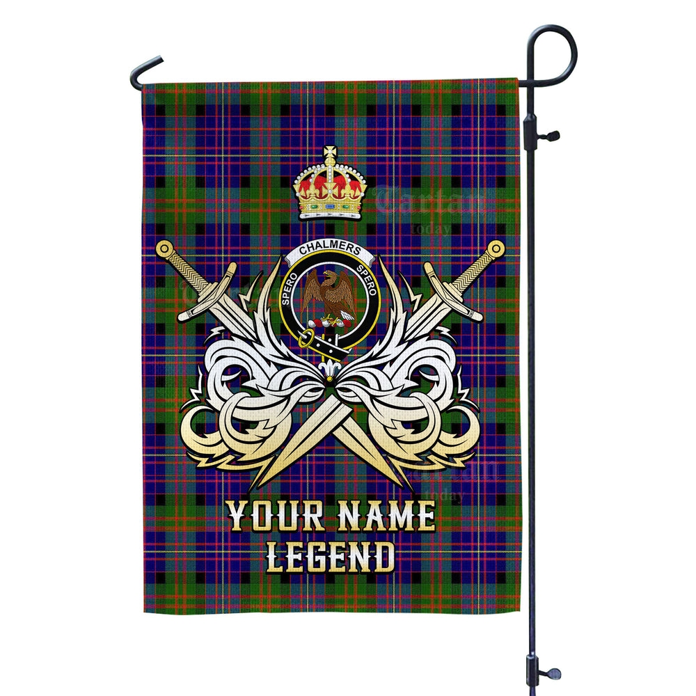 Custom Name Clan Chalmer Tartan Garden Flag with Clan Crest and the Golden Sword of Courageous Legacy JB62