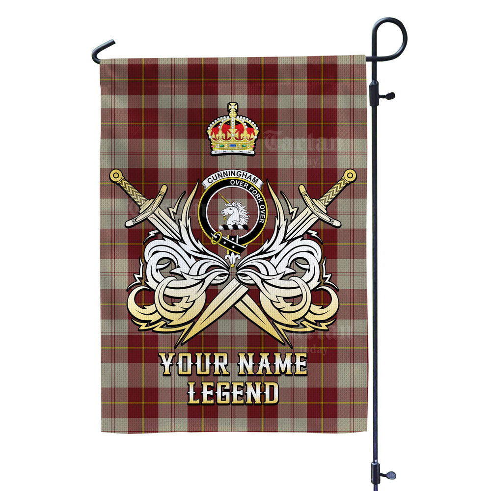 Custom Name Clan Cunningham Burgundy Dancers Tartan Garden Flag with Clan Crest and the Golden Sword of Courageous Legacy EW96