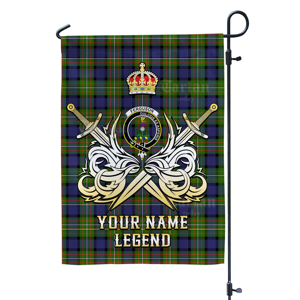 Custom Name Clan Fergusson Modern Tartan Garden Flag with Clan Crest and the Golden Sword of Courageous Legacy LU94