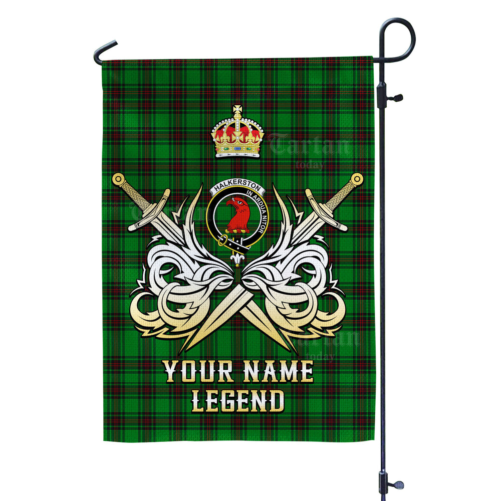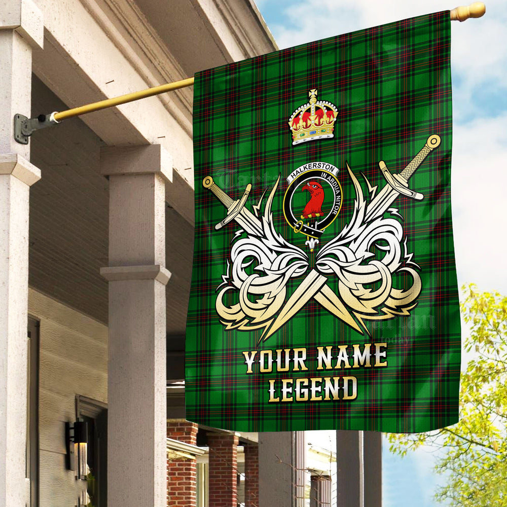 Custom Name Clan Halkerston Tartan Garden Flag with Clan Crest and the Golden Sword of Courageous Legacy NN99