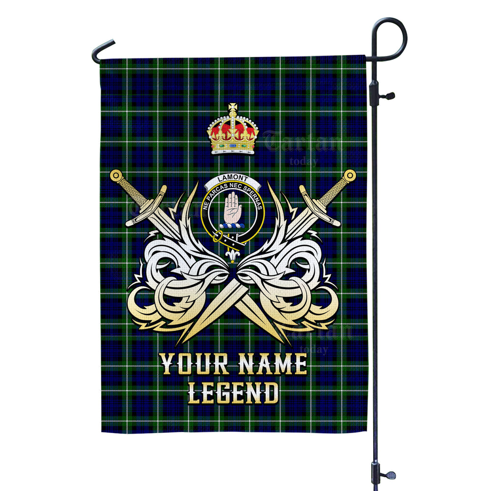 Custom Name Clan Lamont Modern Tartan Garden Flag with Clan Crest and the Golden Sword of Courageous Legacy PU38
