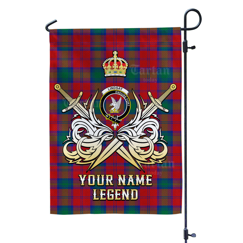 Custom Name Clan Lindsay Modern Tartan Garden Flag with Clan Crest and the Golden Sword of Courageous Legacy KM49