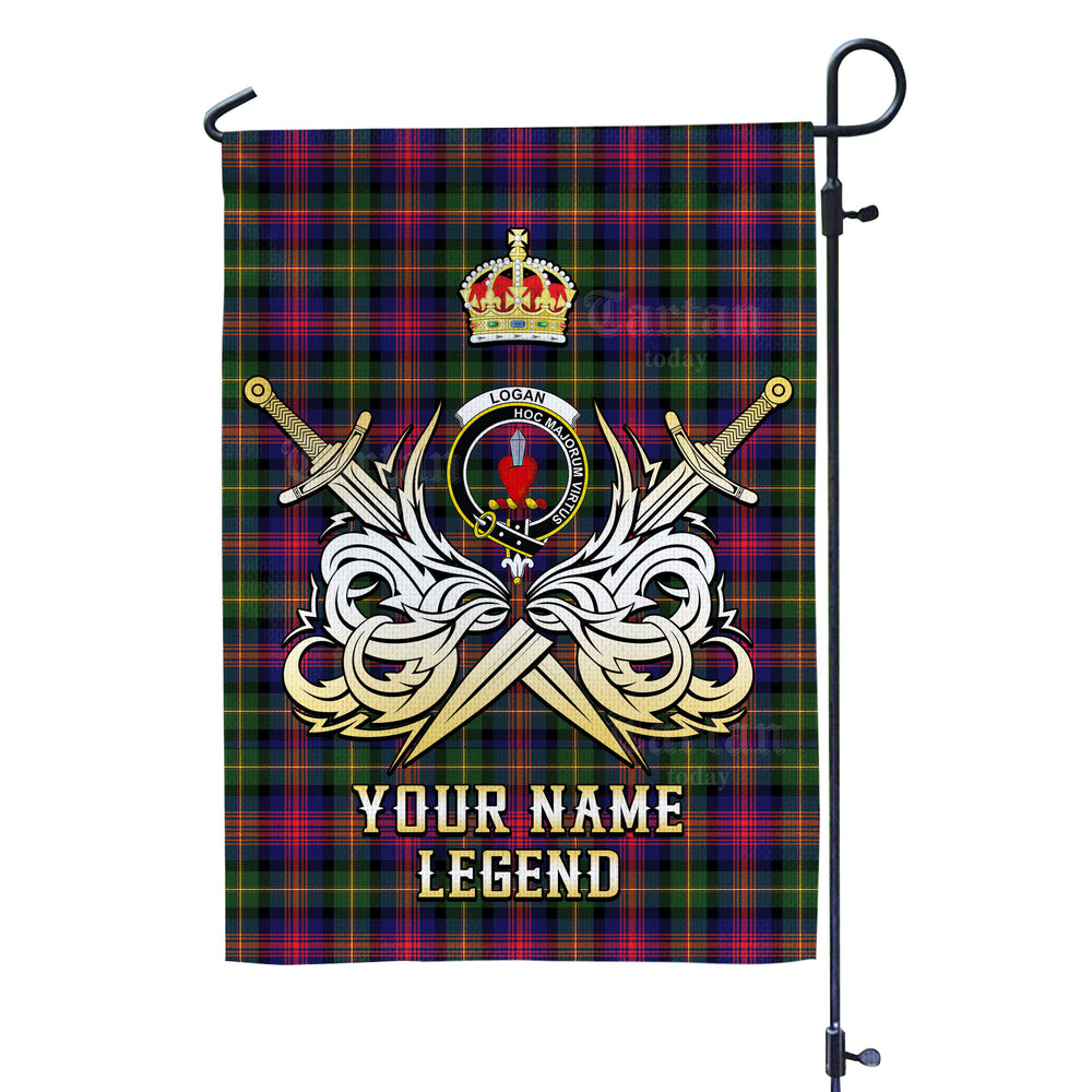 Custom Name Clan Logan Modern Tartan Garden Flag with Clan Crest and the Golden Sword of Courageous Legacy MU43