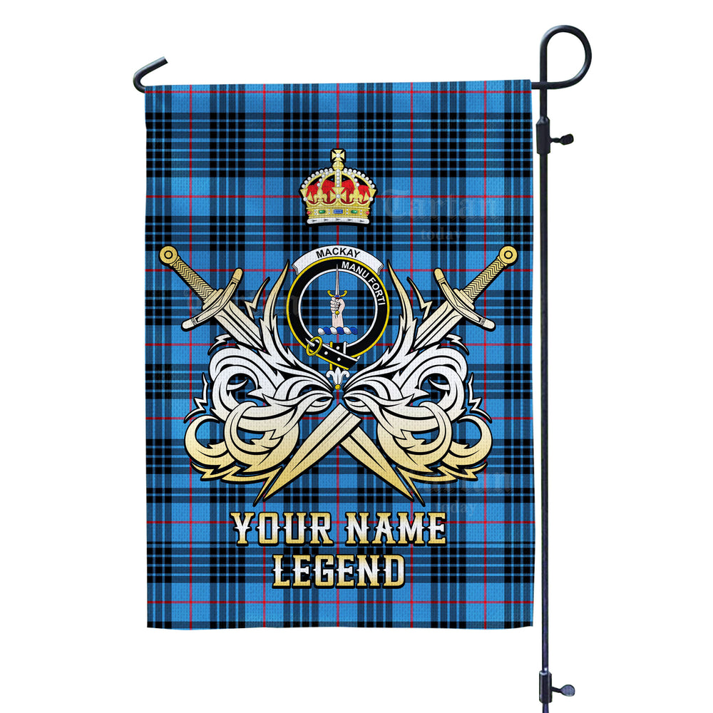 Custom Name Clan MacKay Blue Tartan Garden Flag with Clan Crest and the Golden Sword of Courageous Legacy KM94
