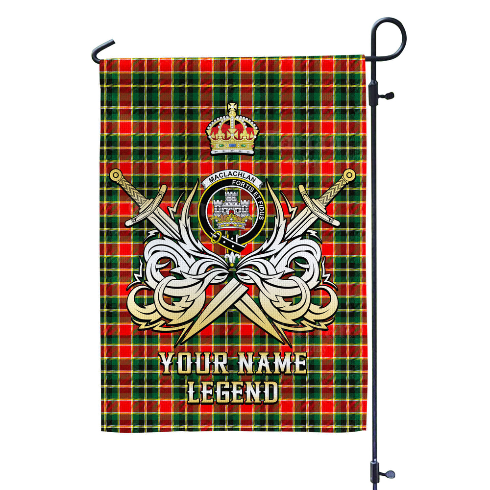 Custom Name Clan MacLachlan Hunting Modern Tartan Garden Flag with Clan Crest and the Golden Sword of Courageous Legacy PL70