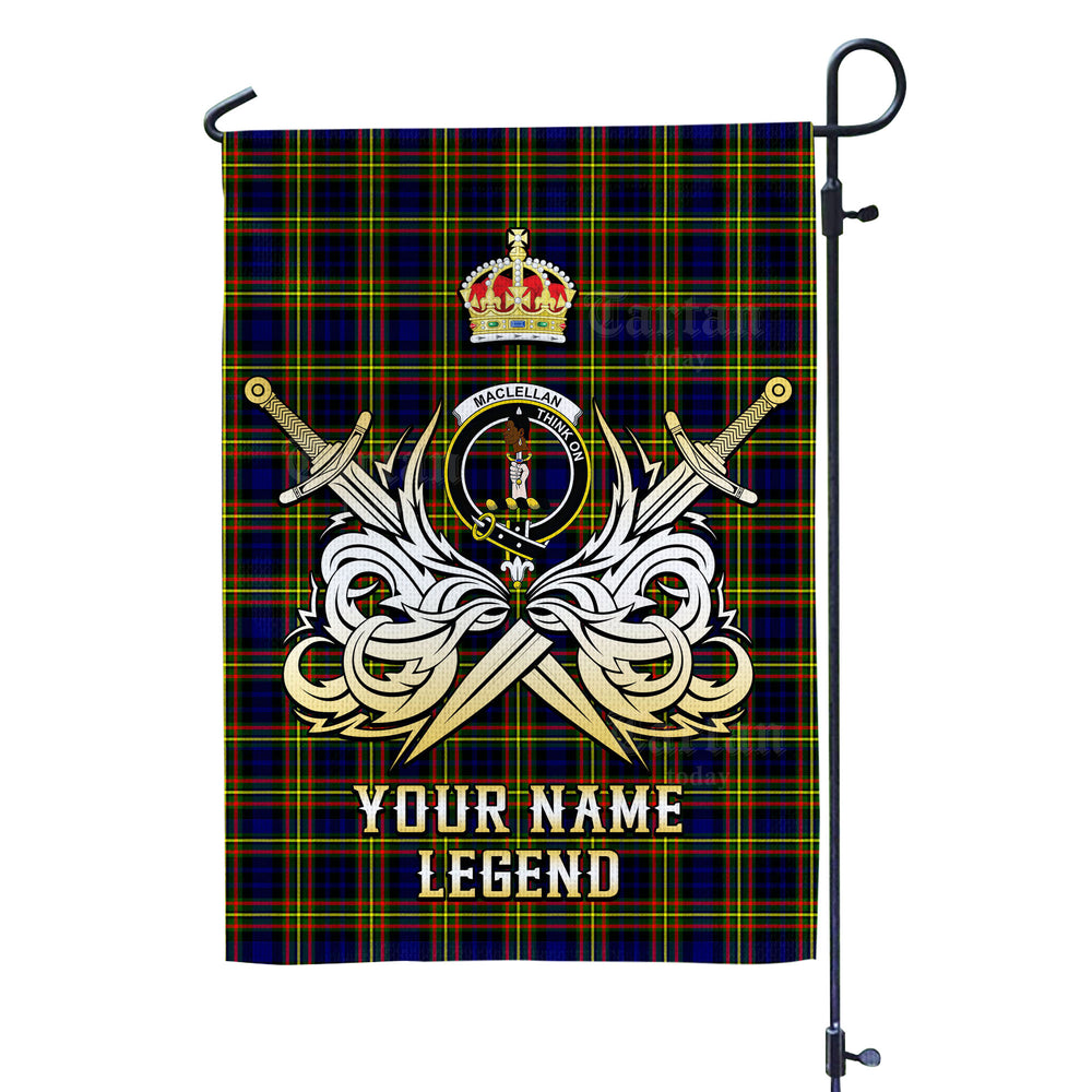Custom Name Clan MacLellan Modern Tartan Garden Flag with Clan Crest and the Golden Sword of Courageous Legacy XV67