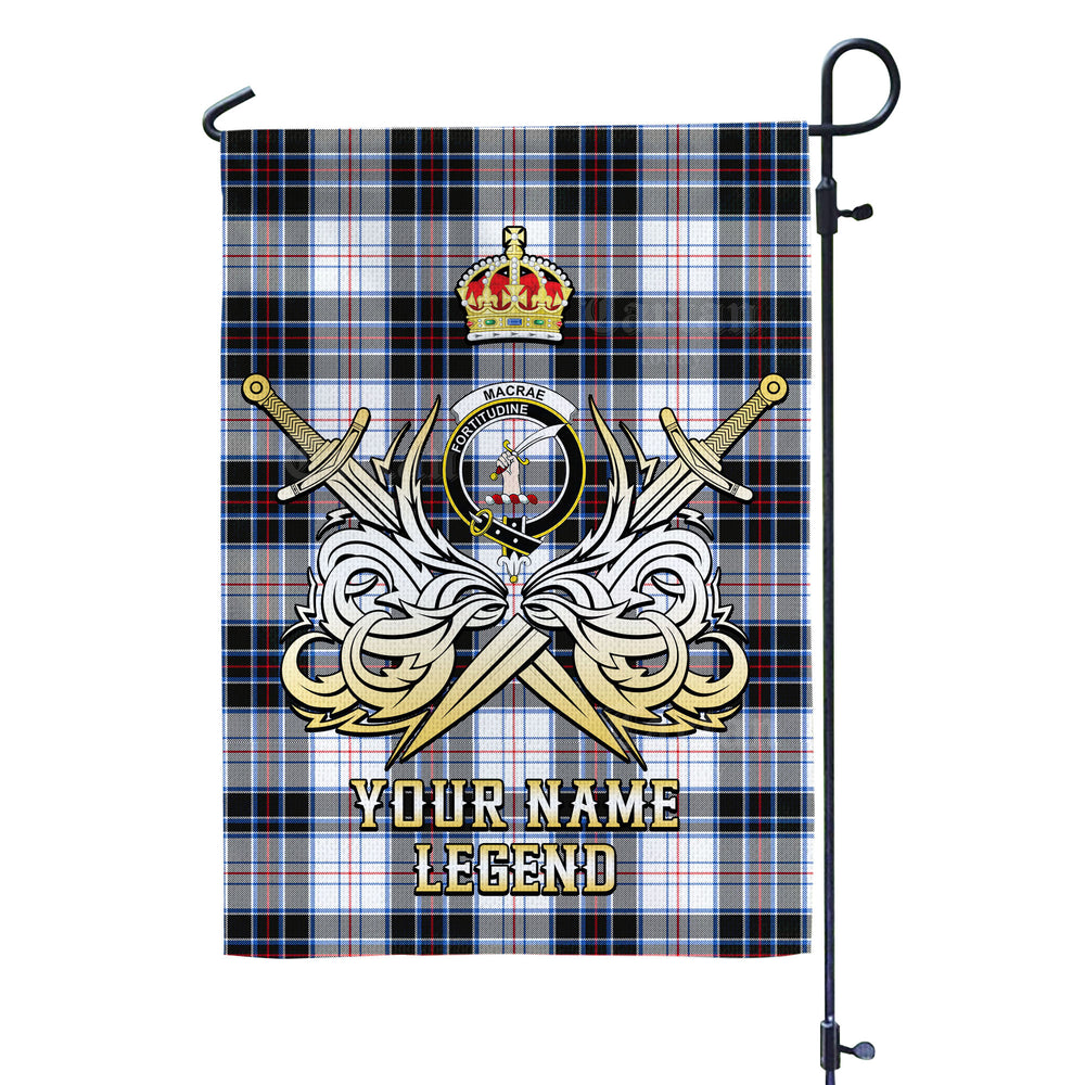 Custom Name Clan MacRae Dress Modern Tartan Garden Flag with Clan Crest and the Golden Sword of Courageous Legacy PQ64